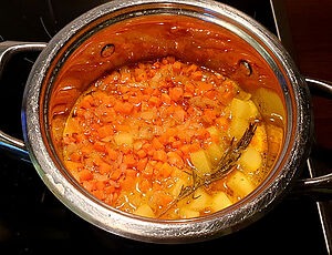 - Моркву з цибулею додати в каструлю з гарбузом та картоплею.