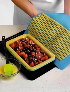 За допомогою силіконового килимка підняти решітку з тіста і перевернути її на форму, накриваючи начинку. - Зняти силіконовий килимок.
