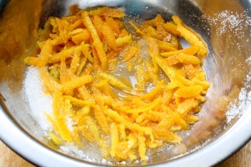 Випікати пиріг з апельсинами 40 хвилин при температурі 170 градусів у вже розпеченій духовці. - Цедру з апельсина порізати тонкими скибочками, змішати з цукром і влити 30-40 мл води.